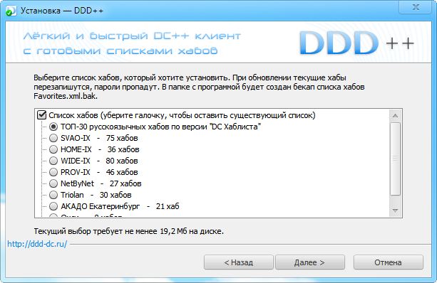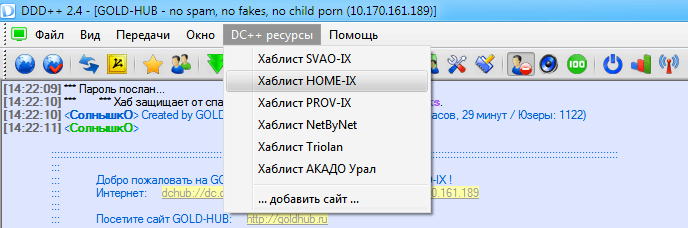 - полный список локальных хабов основных пирингов и сетей (SVAO-IX, HOME-IX, PROV-IX, WIDE-IX, NetByNet, АКАДО-Екатеринбург, Triolan и другие), в которые входит не один десяток провайдеров, а также ТОП-30 крупнейших русскоязычных интернет-хабов по версии dchublist.ru.