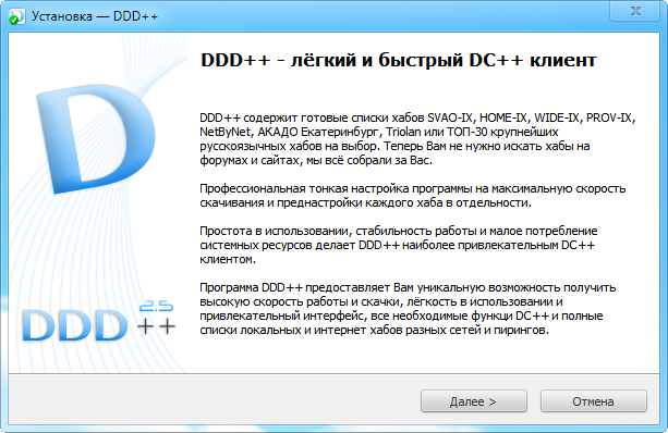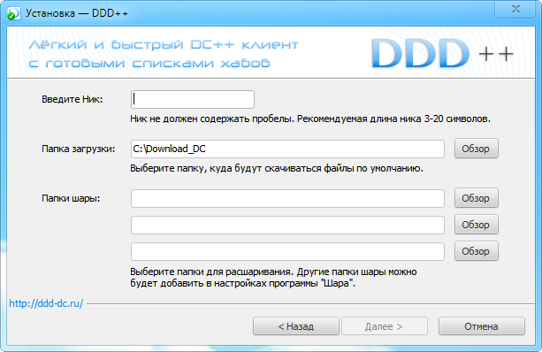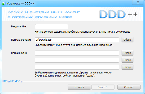 - удобный инсталлятор, имеющий Мастер настроек, где можно ввести Ник (с валидацией символов), указать папку для скачивания и выбрать папки для расшаривания.